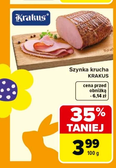 KRAKUS Szyńka krucha w Carrefourze dostępna jest teraz za 3,99 zł zamiast 6,14 zł, dzięki 35% obniżce. Ta delikatna szyńka o gramaturze 100 g idealnie sprawdzi się do kanapek, sałatek lub jako dodatek do drugiego śniadania. Aktualna promocja pozwala zaoszczędzić ponad 2 zł na każdym opakowaniu. Sprawdź ofertę Carrefour i zaopatrz się w smaczną szyńkę w atrakcyjnej cenie.