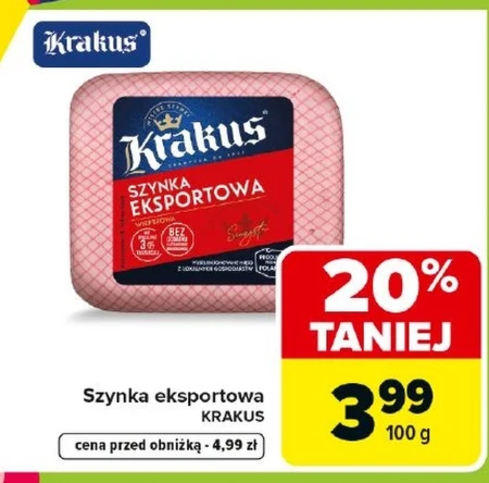 Szynka eksportowa KRAKUS jest dostępna w ofercie Carrefour Market w cenie 3,99 zł za 100 g, co oznacza 20% taniej niż cena regularna 4,99 zł. Ten produkt to doskonały wybór na szybką przekąskę, do kanapek, sałatek czy jako dodatek do dań obiadowych. Jej wyrazisty smak sprawdzi się zarówno w codziennych posiłkach, jak i podczas spotkań z rodziną i przyjaciółmi. Warto skorzystać z tej okazji i zaopatrzyć się w sprawdzoną jakość w atrakcyjnej cenie.