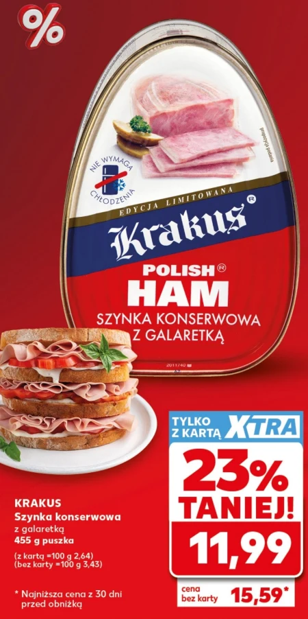 Szynka konserwowa z galaretką Krakus dostępna jest w Kaufland w cenie 11,99 zł za puszkę 455 g, co oznacza 23% taniej niż cena bez karty Xtra wynosząca 15,59 zł. Produkt ten to klasyczna szynka konserwowa w galarecie, idealna na kanapki, przekąski lub jako dodatek do sałatek. Promocja z kartą Xtra to świetna okazja, by zaopatrzyć się w ulubioną szynkę w korzystnej cenie. Źródło: gazetka Kaufland