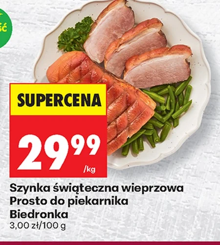 Szynka świąteczna wieprzowa, idealna prosto do piekarnika, dostępna w Biedronce w cenie 29,99 zł za kilogram, co daje 3,00 zł za 100 gram. Sprawdź aktualną gazetkę Biedronka, aby upewnić się, czy promocja nadal obowiązuje. Świetnie sprawdzi się jako główny element świątecznego obiadu.
