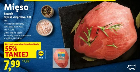 Rzeźnik Szynka wieprzowa, XXL 1 kg * cena przed obniżką/ cena poza promocją: 1 kg = 17,99 Limit: 5 kg na kupon. Szczegóły promocji dostępne w aplikacji Lidl Plus.