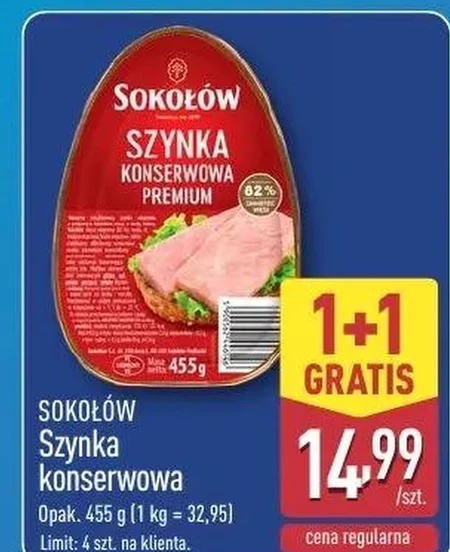 Sokołów szyńka konserwowa Premium występuje w ofercie Aldi w cenie 14,99 za opakowanie 455 g (1 kg = 32,95), przy czym obowiązuje promocja 1+1 GRATIS. To wysokiej jakości szyńka konserwowa, idealna do kanapek, sałatek lub jako dodatek do dań gotowych. Przy zakupie dwóch opakowań, zapłacisz tylko za jedno, a limit zakupów to 4 sztuki na klienta. Warto skorzystać z tej okazji, aby zaopatrzyć się w smaczną i wygodną w użyciu szyńkę. Oferta ważna od 2026-04-30 do 2026-05-02 Źródło: gazetka Aldi