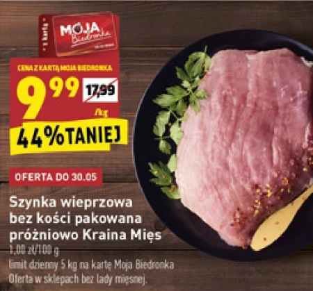 Synka wieprzowa bez kości pakowana próżniowo. Podana cena obowiązuje z kartą Moja Biedronka. Limit dzienny 5 kg na kartę Moja Biedronka.