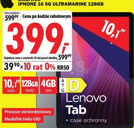 Lenovo Tab to tablet z 10,1-calowym ekranem, wyposażony w 128 GB pamięci i 4 GB RAM, idealny do przeglądania internetu, oglądania filmów i pracy. Obecnie dostępny w Media Expert w atrakcyjnej cenie 399,- dzięki kodowi rabatowemu, zamiast 599,99, a dodatkowo można go kupić w 10 ratach 0%. W zestawie znajduje się również case ochronny, który zabezpieczy urządzenie przed uszkodzeniami, a wydajny procesor MediaTek Helio G85 zapewnia płynne działanie.