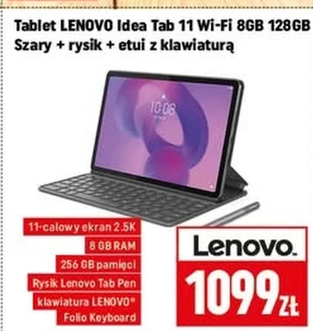 Tablet LENOVO Idea Tab 11 Wi-Fi 8GB 128GB Szary + rysik + etui z klawiaturą 11-calowy ekran 2.5K 8 GB RAM 256 GB pamięci Rysik Lenovo Tab Pen klawiatura LENOVO° Folio Keyboard 1099,99 zł