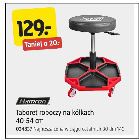Regulowany taboret roboczy Hamron na kółkach pozwoli wygodnie pracować w zakresie wysokości 40-54 cm. Aktualnie dostępny w niższej cenie 129,- (poprzednio 149,-) w najnowszej gazetce Jula, jest to okazja na zakup praktycznego sprzętu do warsztatu, garażu czy domu. Taboret sprawdzi się podczas napraw, majsterkowania, a także przy codziennych pracach wymagających siedzącej pozycji. Numer katalogowy produktu to 024837.