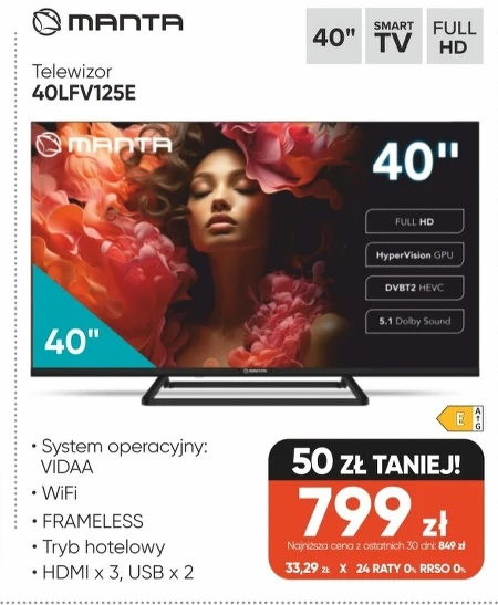 Telewizor 40LFV125E • System operacyjny: VIDAA • WiFi • FRAMELESS • Tryb hotelowy • HDMI x 3, USB x 2