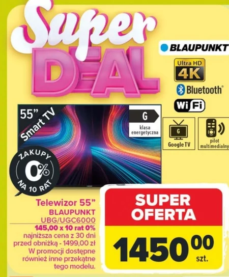 Telewizor 55" BLAUPUNKT UBG/UGC6000 145,00 x 10 rat 0% najniższa cena z 30 dni przed obniżką - 1499,00 zł W promocji dostępne również inne przekątne tego modelu.