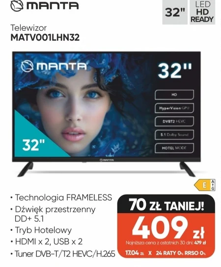Telewizor MATV001LHN32 • Technologia FRAMELESS • Dźwięk przestrzenny DD+ 5.1 • Tryb Hotelowy • HDMI x 2, USB x 2 • Tuner DVB-T/T2 HEVC/H.265