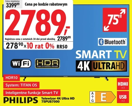 Telewizor Philips 75PUS7000 o przekątnej 75 cali oferuje obraz w technologii 4K Ultra HD z obsługą HDR10, zapewniając wyjątkową jakość i głębię kolorów. Dzięki wbudowanemu WiFi i Bluetooth połączysz go z siecią oraz innymi urządzeniami bezprzewodowo. Aktualnie w Media Expert można go nabyć w atrakcyjnej cenie 2789,- dzięki kodowi rabatowemu, a dodatkowo dostępna jest możliwość rozłożenia płatności na 10 rat 0%. Model ten z systemem Titan OS i funkcjami Smart TV idealnie sprawdzi się do oglądania filmów, seriali, grania w gry i korzystania z aplikacji.