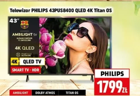 Telewizor PHILIPS 43PUS8400 QLED 4K Titan OS 43" AMBILIGHT tv OFFICIAL PARTNER FC BARCELONA 4K QLED PHILIPS ULTRA HD 4K QLED TV SMART TV • HDR PHILIPS 1799,99 zł AMBILIGHT DOLBY ATMOS TITAN OS