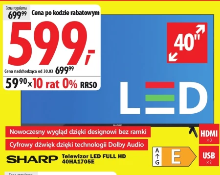 Telewizor LED SHARP 40HA1705E oferuje obraz w jakości Full HD na 40-calowym ekranie, a jego bezramkowa konstrukcja wpisuje się w nowoczesny design. Dzięki technologii Dolby Audio zapewnia cyfrowy dźwięk wysokiej jakości, idealny do oglądania filmów i programów. Aktualnie w Media Expert można go nabyć w atrakcyjnej cenie 599,- dzięki kodowi rabatowemu, a dodatkowo sklep oferuje możliwość zakupu na 10 rat 0%. Sprawdzi się jako centralny punkt rozrywki w salonie lub sypialni, umożliwiając podłączenie urządzeń przez porty HDMI i USB.