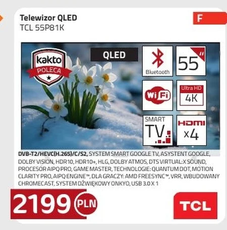 Telewizor QLED TCL 55P81K DVB-T2/HEVC(H.265)/C/S2, SYSTEM SMART GOOGLE TV, ASYSTENT GOOGLE, DOLBY VISION, HDR10, HDR10+, HLG, DOLBY ATMOS, DTS VIRTUAL:X SOUND, PROCESÓRAIPQ PRO, GAME MASTER, TECHNOLOGIE: QUANTUM DOT, MOTION CLARITY PRO, AIPQ ENGINE", DLA GRACZY: AMD FREESYNC™,VRR, WBUDOWANY CHROMECAST, SYSTEM DŹWIĘKOWY ONKYO, USB 3.0X 1