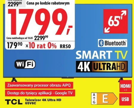 Telewizor TCL 65V6C 4K Ultra HD jest dostępny w ofercie Media Expert w cenie 1799,99 zł, dzięki kodowi rabatowemu, podczas gdy cena regularna wynosi 2299,99 zł. Ten 65-calowy model oferuje wyjątkową jakość obrazu dzięki zaawansowanemu procesorowi AiPQ i rozdzielczości 4K Ultra HD, idealnie sprawdzi się do oglądania filmów, seriali oraz grania w gry. Telewizor posiada funkcje Smart TV z dostępem do tysięcy aplikacji poprzez Google TV, a także łączność Bluetooth i Wi-Fi, umożliwiając łatwe połączenie z innymi urządzeniami. Dostępne porty HDMI i USB zapewniają wygodę użytkowania. Skorzystaj z atrakcyjnej oferty i ciesz się kinowym doświadczeniem w swoim domu, możliwe również w 10 ratach 0% RRSO od 10 maja. Źródło: gazetka Media Expert