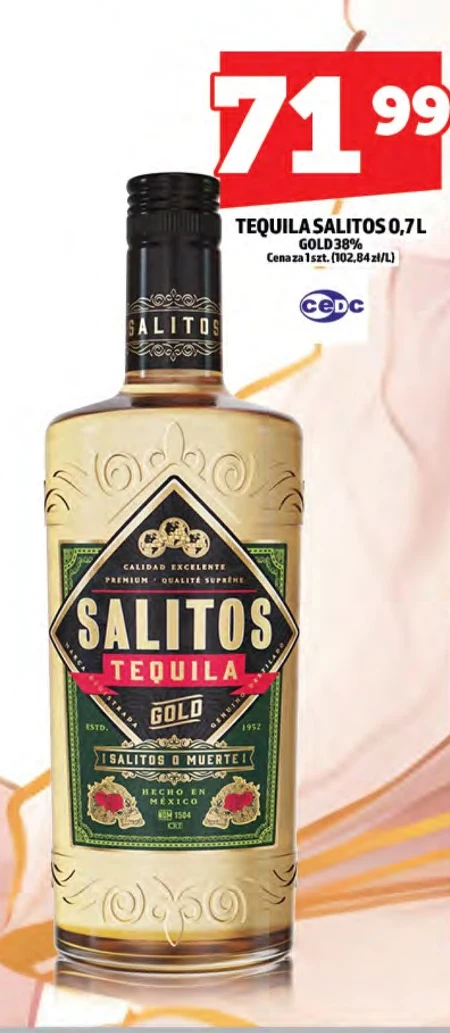 Tequila Salitos 0,7L dostępna jest w ofercie Topaz w cenie 71,99 zł, co daje 102,84 zł za litr. Produkt jest tequilą typu Gold o mocy 38% i idealnie nadaje się do przygotowania klasycznych koktajli, takich jak Margarita czy Tequila Sunrise, a także do degustacji w czystej formie. To propozycja dla osób poszukujących wysokiej jakości trunku do celebracji lub na wyjątkowe okazje. Warto skorzystać z tej okazji, aby zaopatrzyć się w ulubioną tequilę w atrakcyjnej cenie. Oferta ważna od 2026-04-01 do 2026-04-16 Źródło: gazetka Topaz