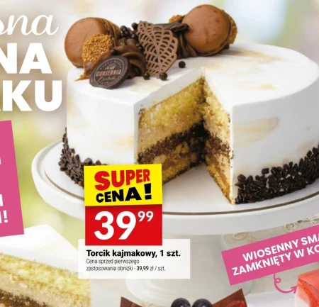 Torcik kajmakowy, o wadze jednej sztuki, jest dostępny w ofercie Twoj Market w cenie 39,99 zł. Ten delikatny deser to idealna propozycja na słodką chwilę, a krem kajmakowy stanowi o jego wyjątkowym smaku. Produkt doskonale sprawdzi się jako dodatek do kawy lub herbaty, a także jako samodzielna przekąska. Skorzystaj z tej okazji i poczuj smak prawdziwego torcika kajmakowego. Oferta ważna od 2026-04-08 do 2026-04-14 Źródło: gazetka Twoj Market