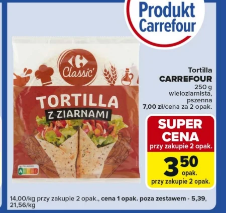 Tortilla Carrefour w opakowaniu 250 g dostępna jest teraz w promocji Super Cena – dwa opakowania kosztują tylko 7,00 zł, co oznacza, że jedno opakowanie przy zakupie dwóch wyjdzie już za 3,50 zł. To pszenna tortilla wieloziarnista, idealna do szybkiego przygotowania burrito, quesadillas lub wrapów. Zniżka obowiązuje przy zakupie dwóch opakowań, co pozwala zaoszczędzić na zapasie ulubionego składnika do dań meksykańskich.