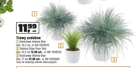 Trawy ozdobne występują w ofercie OBI w cenie od 11,99 zł za sztukę. W asortymencie znajdziesz Kostrzewę Intense Blue w doniczce o średnicy 10,5 cm (nr OBI 6304570) oraz w większej doniczce 17 cm (nr OBI 6205884) za 37,99 zł, a także Ostnicę Stipa Pony Tails w doniczce 10,5 cm za 12,99 zł (nr OBI 7058530). Te piękne rośliny dodadzą uroku Twojemu ogrodowi lub balkonowi, tworząc naturalne, kolorowe kompozycje. Są idealne do nasadzeń w rabatach, na skarpach, a także w pojemnikach, zapewniając efektowny wygląd przez cały sezon. Pamiętaj, że ceny nie obejmują osłonek dekoracyjnych. Oferta ważna od 2026-04-07 do 2026-04-21 Źródło: gazetka OBI