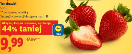 Truskawki w Lidlu dostępne są teraz za 9,99 zł za 500 g, dzięki 44% zniżce z kuponem w aplikacji – cena regularna to 17,99 zł. Szczegóły promocji znajdziesz na stronie 18 gazetki Lidla. Idealnie nadają się do przygotowania letnich deserów lub bezpośredniego spożycia. Aktywuj kupon i zeskanuj aplikację Lidl, aby skorzystać z obniżki.
