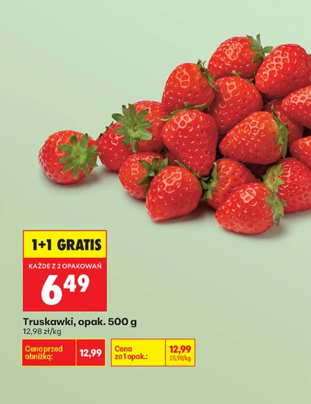 Truskawki, opakowanie 500 g, dostępne w ofercie Biedronka, można nabyć teraz w promocji 1+1 GRATIS, każde z dwóch opakowań w cenie 6,49 zł, co daje 12,98 zł za kilogram. Zazwyczaj kosztują one 12,99 zł za opakowanie, a kilogram 25,98 zł. Świeże truskawki to doskonały wybór na letnie desery, śniadania lub po prostu jako zdrowa przekąska. To świetna okazja, by zaopatrzyć się w te pyszne owoce i cieszyć się ich smakiem w większej ilości. Oferta ważna od 2026-04-13 do 2026-04-18 Źródło: gazetka Biedronka