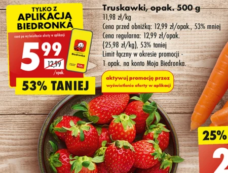 Truskawki, opak. 500 g 11,98 zł/kg Cena przed obniżką: 12,99 zł/opak., 53% mniej Cena regularna: 12,99 zł/opak. (25,98 zł/kg), 53% taniej Limit łączny w okresie promocji - 1 opak. na konto Moja Biedronka.