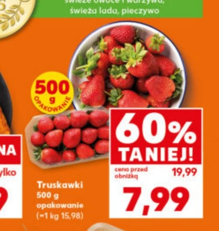 Truskawki dostępne są w ofercie Kaufland w opakowaniu o wadze 500 g w cenie 7,99, co stanowi 60% zniżki względem ceny przed obniżką 19,99 (≈1 kg 15,98). Te świeże truskawki idealnie nadają się do bezpośredniego spożycia, przygotowania deserów, koktajli, dżemów lub jako dodatek do porannych owsianek. To doskonała okazja, aby cieszyć się smakiem lata i przygotować ulubione potrawy z wykorzystaniem tego sezonowego owocu. Warto skorzystać z tej wyjątkowej promocji i zaopatrzyć się w pyszne truskawki w korzystnej cenie. Oferta ważna od 2026-04-07 do 2026-04-08 Źródło: gazetka Kaufland