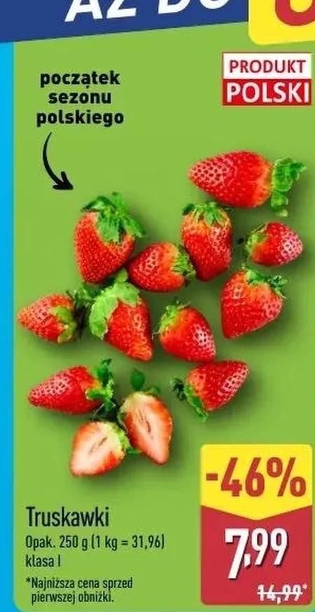 Truskawki są dostępne w ofercie Aldi w cenie 7,99 za opakowanie 250 g, co daje 31,96 za kilogram – to obniżka z wcześniejszej ceny 14,99. Owoce klasy I doskonale nadają się do bezpośredniego spożycia, przygotowywania deserów, koktajli czy przetworów. To idealna propozycja na pyszny i zdrowy posiłek lub słodką przekąskę. Zachęcamy do skorzystania z tej wyjątkowej okazji i cieszenia się smakiem świeżych truskawek. Oferta ważna od 2026-04-30 do 2026-05-02 Źródło: gazetka Aldi