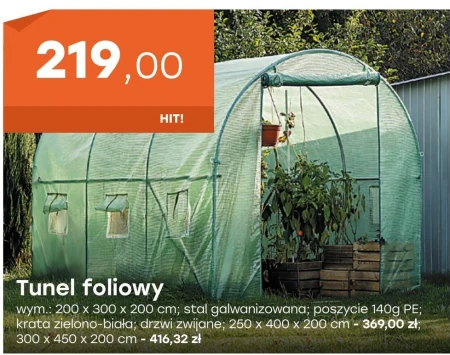 Tunel foliowy wym .: 200 x 300 × 200 cm; stal galwanizowana; poszycie 140g PE; krata zielono-biała; drzwi zwijane; 250 x 400 x 200 cm - 369,00 zł; 300 × 450 x 200 cm - 416,32 zł