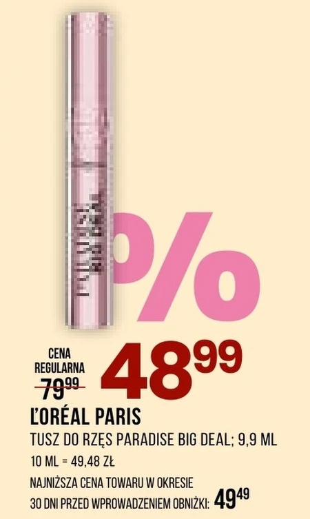 L'ORÉAL PARIS Tusz do rzęs Paradise Big Deal w Drogerie Natura kosztuje teraz 48,99 zł, a cena regularna to 79,99 zł. Opakowanie zawiera 9,9 ml produktu, co daje 49,48 zł za 10 ml. Tusz do rzęs Paradise Big Deal pozwoli na uzyskanie spektakularnej objętości i podkreślenie spojrzenia, a aktualna promocja w Drogerie Natura to najniższa cena w ostatnich 30 dni.