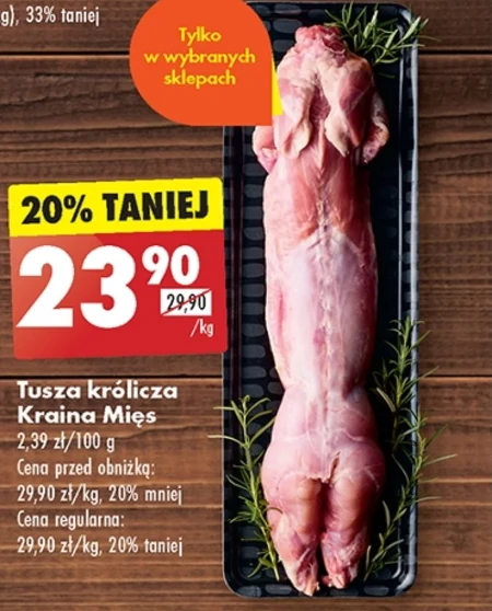 Tusza królicza Kraina Mięs 2,39 zł/100 g Cena przed obniżką: 29,90 zł/kg, 20% mniej Cena regularna: 29,90 zł/kg, 20% taniej