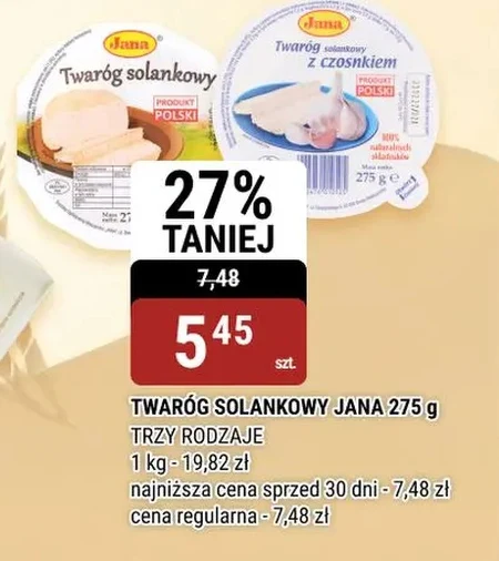 TWARÓG SOLANKOWY JANA 275 g TRZY RODZAJE 1 kg - 19,82 zł najniższa cena sprzed 30 dni - 7,48 zł cena regularna - 7,48 zł