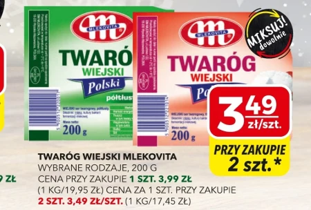 TWARÓG WIEJSKI MLEKOVITA WYBRANE RODZAJE, 200 G CENA PRZY ZAKUPIE 1 SZT. 3,99 ZŁ (1 KG/19,95 ZŁ) CENA ZA 1 SZT. PRZY ZAKUPIE 2 SZT. 3,49 ZŁ/SZT. (1 KG/17,45 ZŁ)