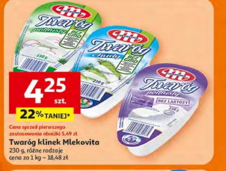 Twaróg kliniek Mlekovita jest dostępny w ofercie Auchan w cenie 18,48 zł za kilogram, opakowanie 230 g jest przecenione o 22% z ceny 5,49 zł. Ten produkt to doskonały składnik do wielu dań, zarówno na słodko jak i na słono – od serników i placków po dania obiadowe i pasty. Można go wykorzystać jako samodzielny składnik śniadaniowy lub dodatek do ulubionych potraw. Warto skorzystać z tej okazji i zaopatrzyć się w twaróg w atrakcyjnej cenie. Oferta ważna od 2026-04-16 do 2026-04-22 Źródło: gazetka Auchan