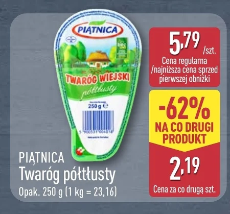 Piątnica Twaróg półtłusty w Aldi kosztuje 2,19 zł za opakowanie przy zakupie dwóch sztuk, dzięki promocji -62% na drugi produkt. Opakowanie zawiera 250 g twarogu, co daje cenę 1 kg w wysokości 23,16 zł. Regularna cena pojedynczego opakowania to 5,79 zł. Twaróg półtłusty Piątnica idealnie nadaje się do przygotowania serników, naleśników lub jako składnik pożywnych śniadań.