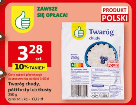 Twaróg chudy, półtłusty lub tłusty dostępny jest w ofercie Auchan w cenie 13,12 zł za kilogram. Opakowanie zawiera 250 gram produktu, a aktualnie można go nabyć 10% taniej, obniżając cenę do 3,28 zł z pierwotnych 3,65 zł. Ten wartościowy ser twarogowy o niskiej zawartości tłuszczu to doskonały wybór do codziennej diety, sprawdzi się zarówno na słodko, jak i na słono. Produkt jest wytwarzany w Polsce i charakteryzuje się wysoką zawartością białka oraz niską wartością energetyczną. Oferta ważna od 2026-04-09 do 2026-04-15 Źródło: gazetka Auchan