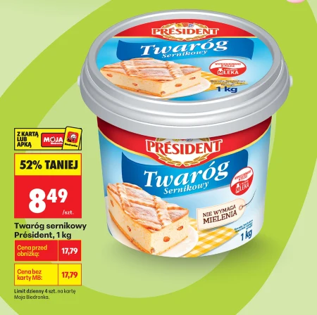 Twaróg semikowy Président, 1 kg 52% TANIEJ 8,49 /szt. Cena przed obniżką: 17,79 Cena bez karty MB: 17,79 Limit dzienny 4 szt. na kartę Moja Biedronka