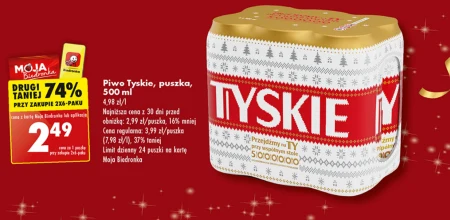 Piwo Tyskie, puszka, 500 ml 4,98 zł/l Najniższa cena z 30 dni przed obniżką: 2,99 zł/puszka, 16% mniej Cena regularna: 3,99 zł/puszka (7,98 zł/1), 37% taniej Limit dzienny 24 puszki na kartę Moja Biedronka