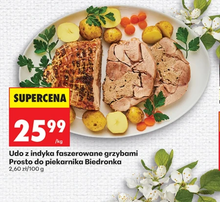 Udo z indyka faszerowane grzybami występuje w ofercie Biedronka w cenie 25,99 zł za kilogram, co daje 2,60 zł za 100 gram. Ten gotowy do pieczenia produkt to propozycja na smaczny i sycący obiad bez zbędnego wysiłku w kuchni. Wystarczy włożyć go do piekarnika i cieszyć się aromatycznym indykiem z delikatnym, grzybowym nadzieniem. To wyjątkowa okazja, by spróbować wyrafinowanego dania w przystępnej cenie.