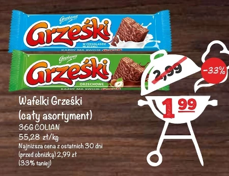 Wafelki Grześki (cały asortyment) 36G COLIAN 55,28 zł/kg Najniższa cena z ostatnich 30 dni (przed obniżką) 2,99 zł (33% taniej)