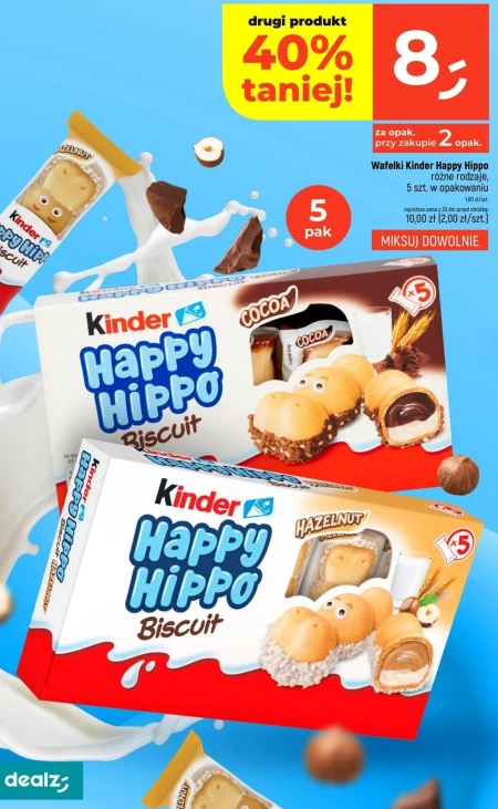 Wafelki Kinder Happy Hippo różne rodzaje, 5 szt. w opakowaniu 100g/szt. najniższa cena w 30 dni przed ceną 10,00 zł (2,00 zł/szt.)