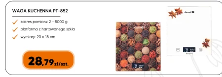 WAGA KUCHENNA PT-852 zakres pomiaru: 2 - 5000 g platforma z hartowanego szkła wymiary: 20 x 18 cm