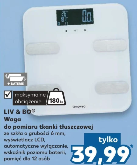 LIV & BOⓇ Waga do pomiaru tkanki tłuszczowej ze szkła o grubości 6 mm, wyświetlacz LCD, automatyczne wyłączanie, wskaźnik poziomu baterii, pamięć dla 12 osób.