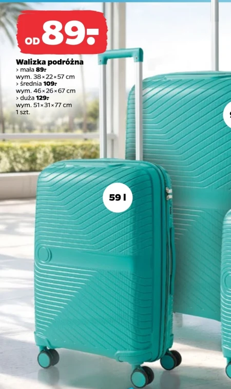 Walizka podróżna › mała 89 zł: wym. 38 x 22 × 57 cm; › Średnia 109 zł: wym. 46 × 26 × 67 cm › duża 129 zł: wym. 51 ×31×77 cm 1 szt.