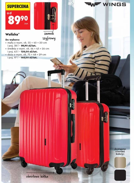 Walizka Do wyboru: mała o wym. ok. 55 x 40 x 20 cm i poj. 38 l-89,90 zł/szt. średnia o wym. ok. 64 x 43 x 26 cm i poj. 63 l-129,00 zł/szt. duża o wym. ok. 75 x 48 x 29 cm i poj. 97 l-149,00 zł/szt.
