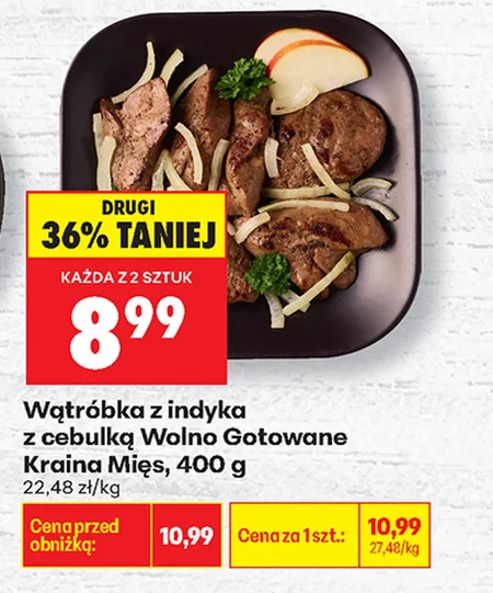 Wątróbka z indyka z cebulką Wolno Gotowane Kraina Mięs, 400 g 22,48 zł/kg Cena przed obniżką: 10,99 Cena za 1 szt.: 10,99 27,48/kg DRUGI 36% TANIEJ KAŻDA Z 2 SZTUK 8,99 Wątróbka z indyka Kraina Mięs z cebulką, wolno gotowana, dostępna w opakowaniach po 400 g. Aktualnie w Biedronce kosztuje 10,99 zł za sztukę, co daje cenę 22,48 zł/kg, jednak kupując dwie sztuki, otrzymasz 36% zniżki, obniżając cenę do 8,99 zł za opakowanie i 17,98 zł/kg. Cena przed promocją wynosiła 10,99 zł. Idealna baza do szybkiej i taniej kolacji.