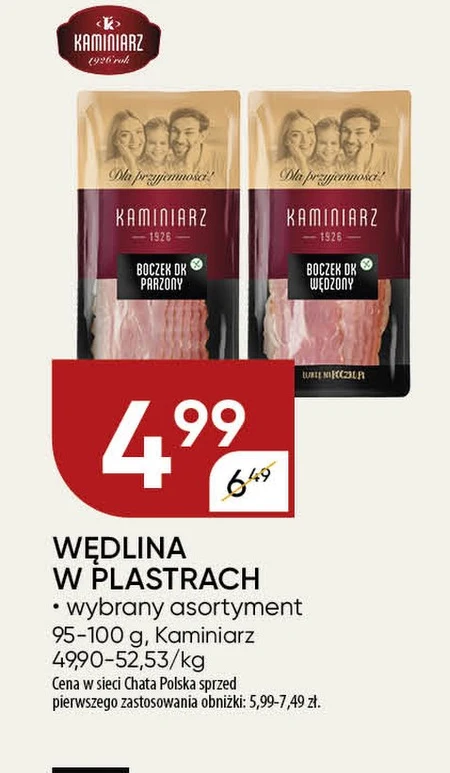 WĘDLINA W PLASTRACH · wybrany asortyment 95-100 g, Kaminiarz 49,90-52,53/kg Cena w sieci Chata Polska sprzed pierwszego zastosowania obniżki: 5,99-7,49 zł.