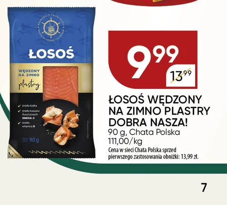 ŁOSOŚ WĘDZONY NA ZIMNO PLASTRY DOBRA NASZA! 90 g, Chata Polska 111,00/kg Cena w sieci Chata Polska sprzed pierwszego zastosowania obniżki: 13,99 zł.