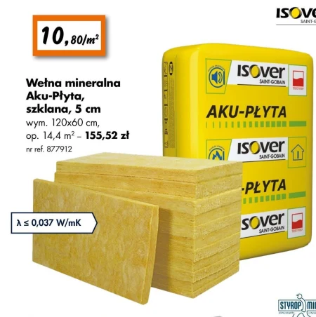 Wełna mineralna Aku-Płyta, szklana, 5 cm wym. 120x60 cm, op. 14,4 m2 - 155,52 zł nr ref. 877912