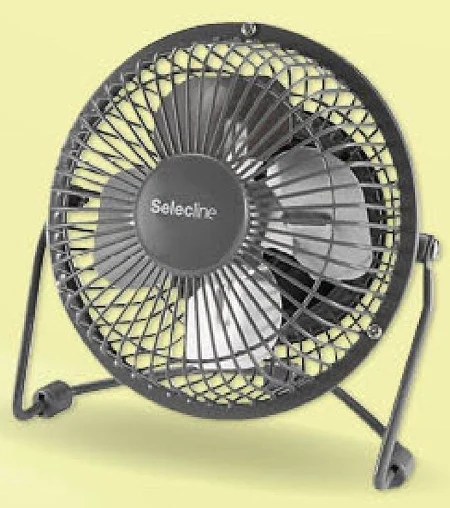 Miniwentylator USB Selecline QT-U401 śr. 10 cm, moc 3 W, 1 prędkości, ruchoma główka, w zestawie końcówka do gniazdka elektrycznego.