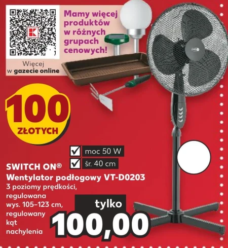 Wentylator podłogowy VT-D0203 3 poziomy prędkości, regulowana wys. 105-123 cm, regulowany kąt nachylenia. Moc 50 W. Średnica 40 cm.